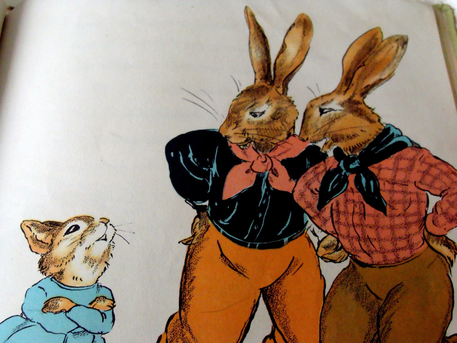 I just love this illustration with her little arms folded and her nose in the air. The Jack Rabbits tell her to go back to the country and eat a carrot. The story states that she had a husband, and then one day, much to her surprise there were twenty-one Cottontail babies to take care of. She is ridiculed again by the great big men bunnies. Only a country rabbit would go and have all those babies.